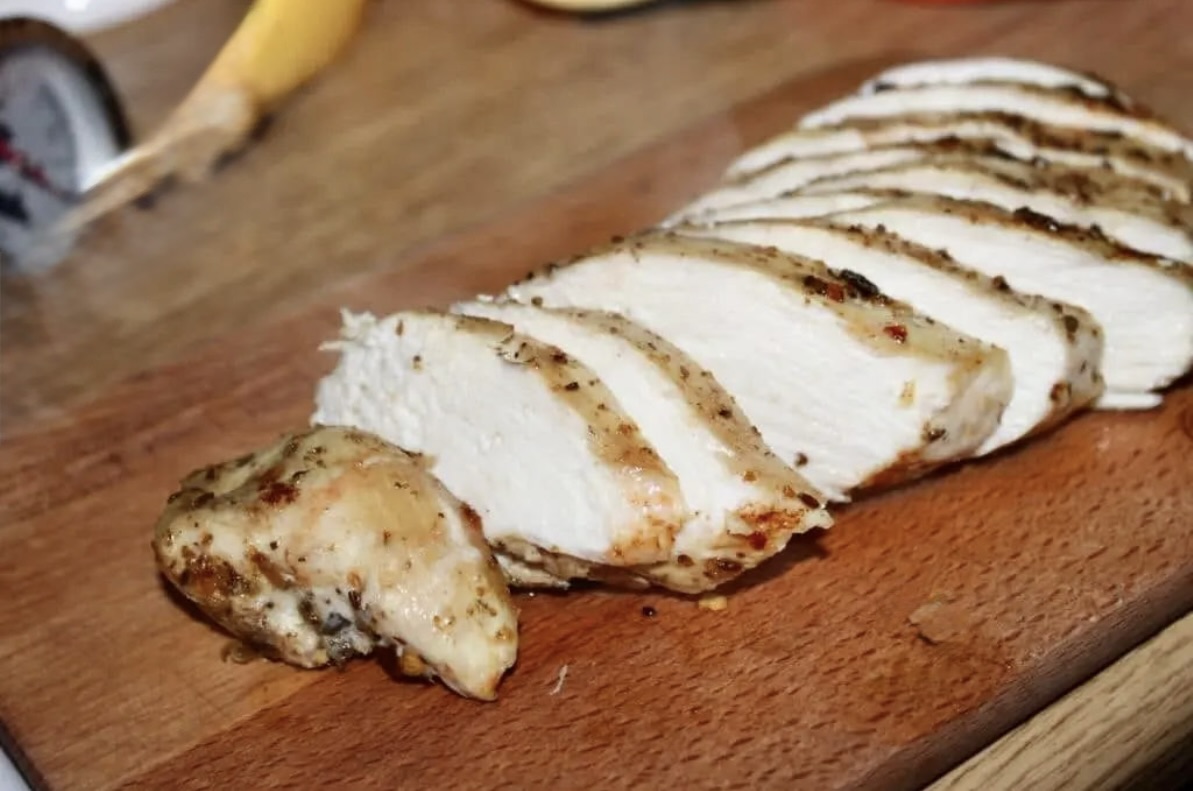Pieczenie: Umieść pierś w naczyniu żaroodpornym, przykryj (pokrywką lub folią aluminiową) i wstaw do piekarnika nagrzanego do 200°C. Piecz przez około 40 minut (czas zależy od wielkości piersi).