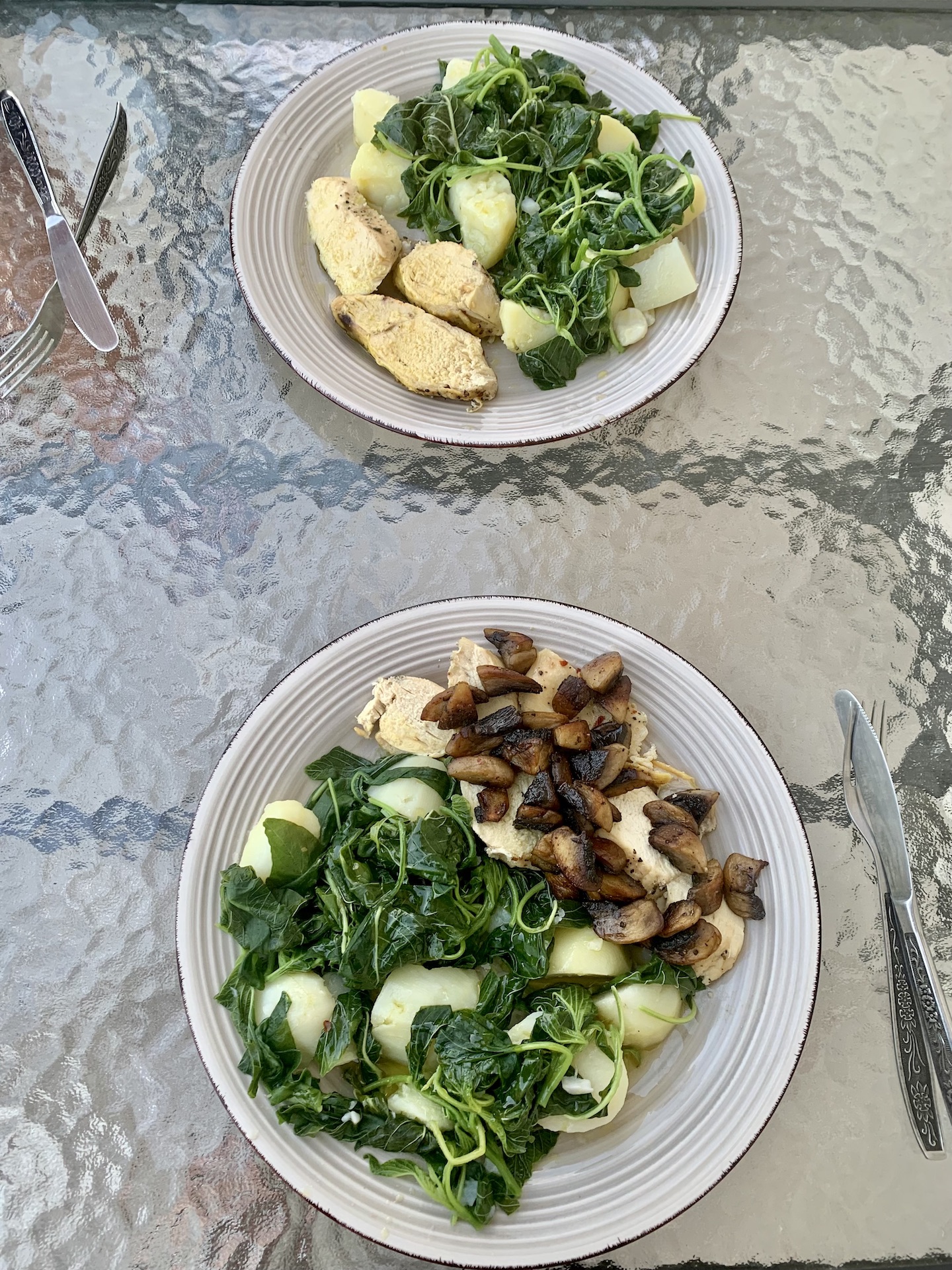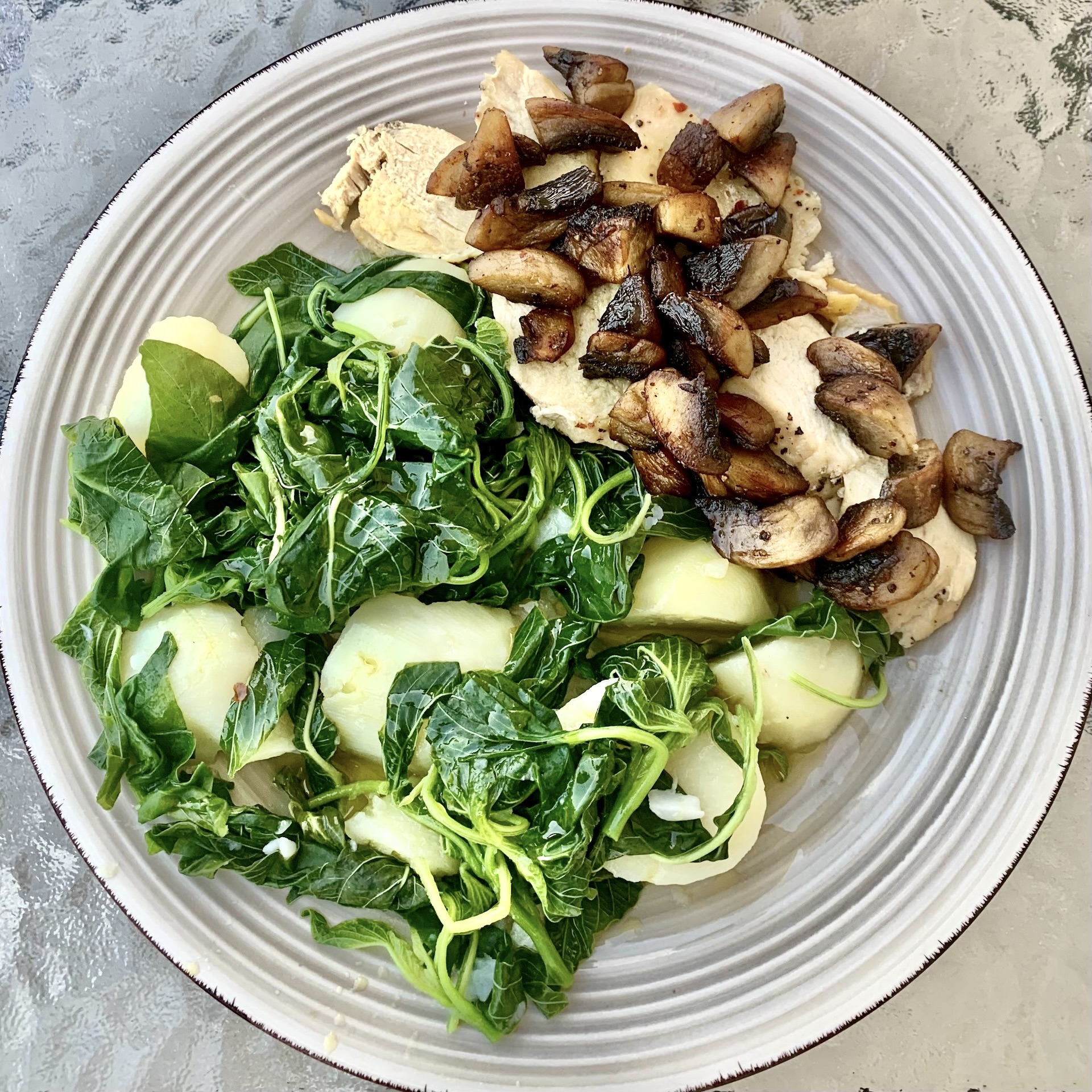 Podanie: Upieczonego kurczaka podawaj z przygotowanymi pieczarkami, szpinakiem i ziemniakami.
