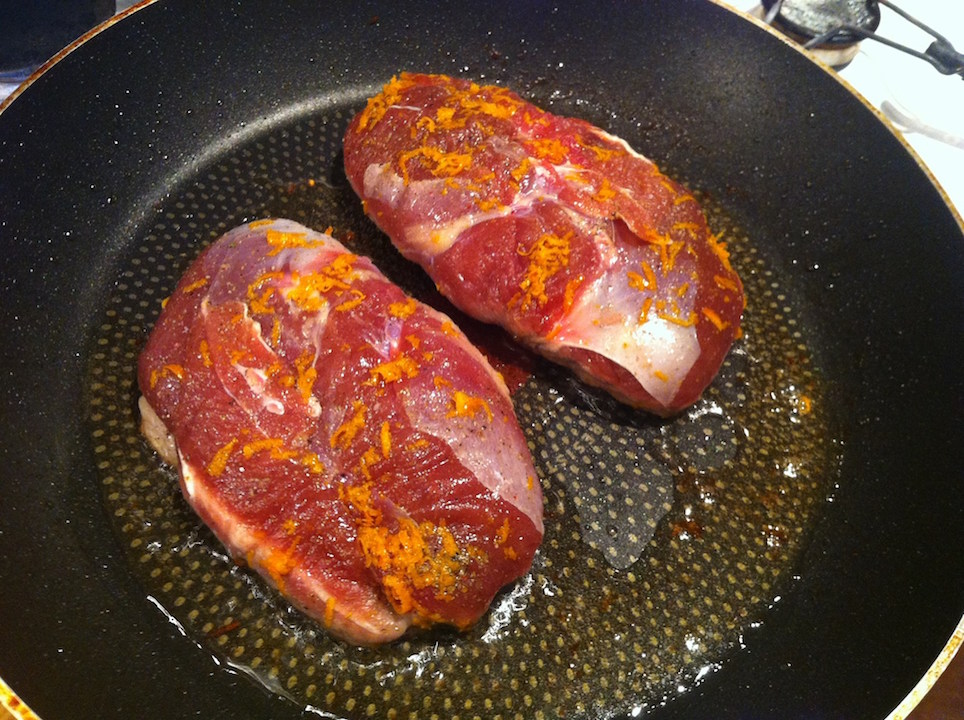 Mięso oprósz solą, pieprzem oraz startą skórką pomarańczową.