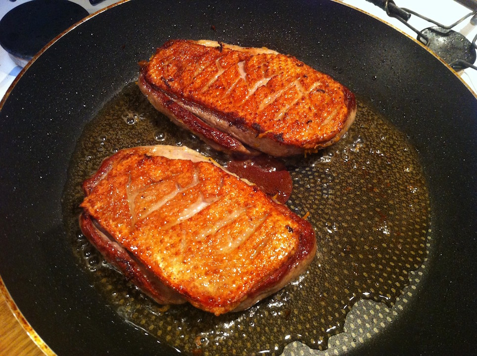 Połóż piersi na zimnej lub średnio rozgrzanej patelni skórą do dołu (nie dodawaj tłuszczu – wytopi się z kaczki).