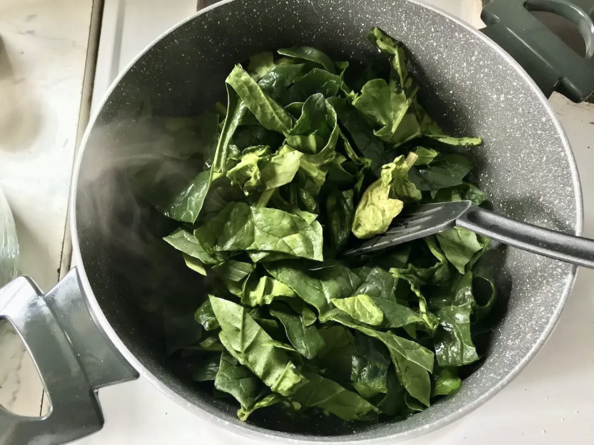 Dodaj posiekany szpinak, dopraw solą oraz pieprzem. Smaż do momentu, aż szpinak zmniejszy objętość i odparuje z niego woda.