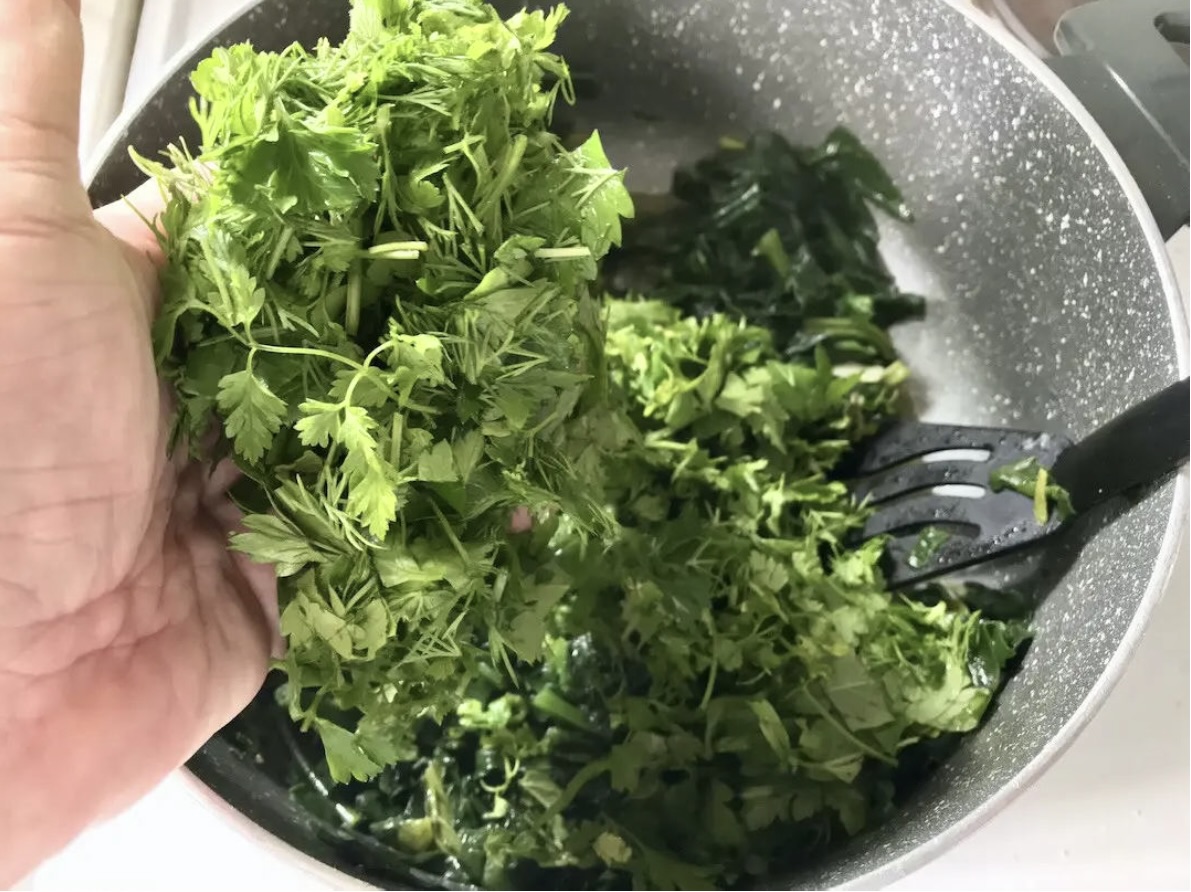 Dodaj posiekany koperek, miętę i natkę pietruszki. Wymieszaj, a następnie smaż chwilę, aby zioła uwolniły aromat.