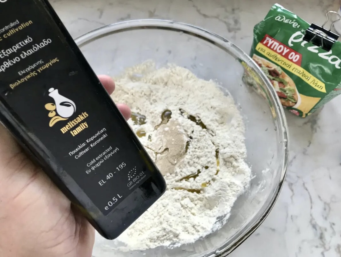 W misce wymieszaj mąkę z solą i drożdżami. Dodaj oliwę.