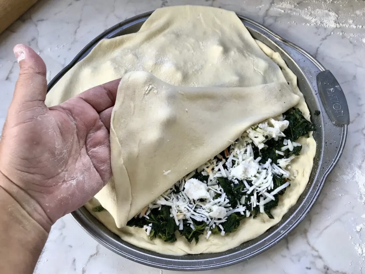 Rozwałkuj drugą część ciasta i przykryj nią farsz. Zaciśnij brzegi, aby zamknąć pitę.