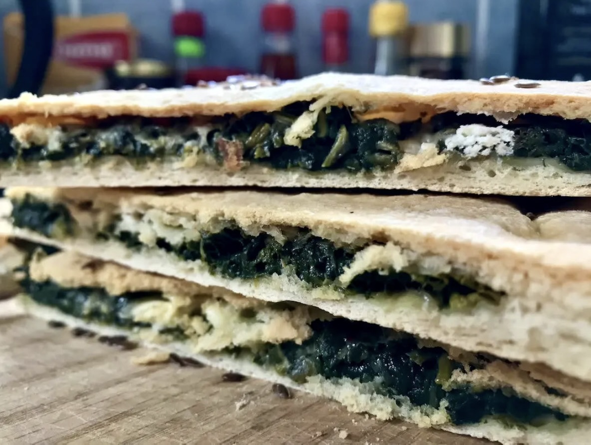 Pita ze szpinakiem smakuje doskonale zarówno na ciepło, jak i po całkowitym wystudzeniu.