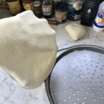 Gotowe ciasto podziel na dwie równe części. Pierwszą część rozwałkuj cienko, a następnie wyłóż nią formę (np. do pizzy lub tary).