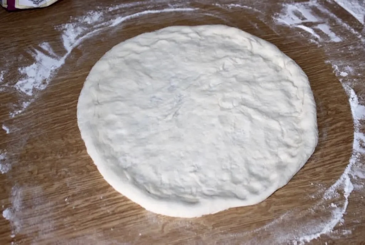Formowanie ciasta: Wyłóż gotowe ciasto na lekko podsypany mąką blat. Delikatnie rozpłaszcz ciasto ręką, a następnie palcami, rozciągając je od środka na zewnątrz, aby stworzyć cienki placek z nieco wyższym brzegiem (rancikiem). Ważne: Ciasta nie wolno wałkować, aby nie straciło elastyczności. Na koniec uformuj ostateczny kształt, przekładając ciasto w dłoniach i jednocześnie obracając.
