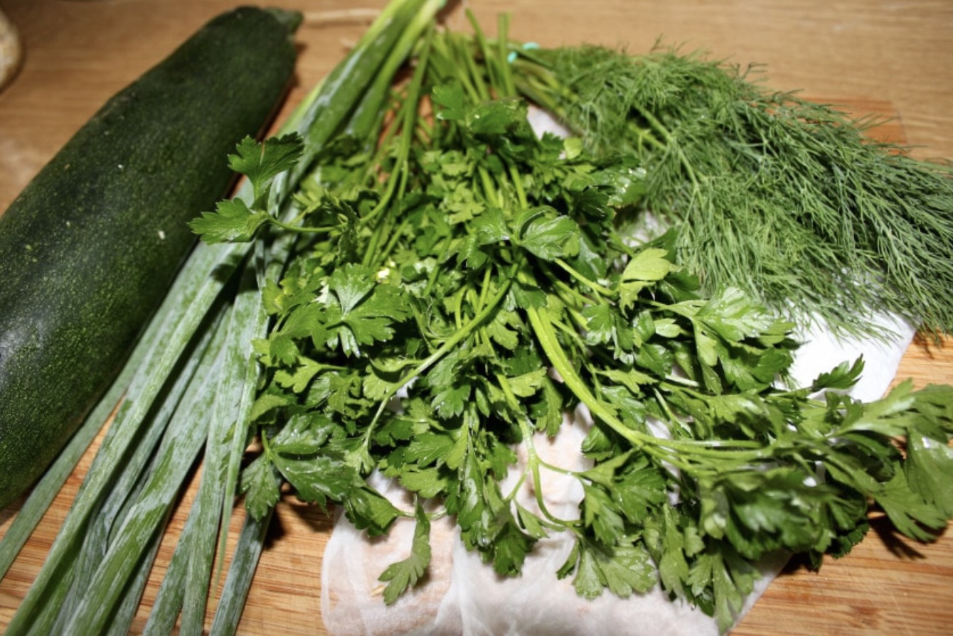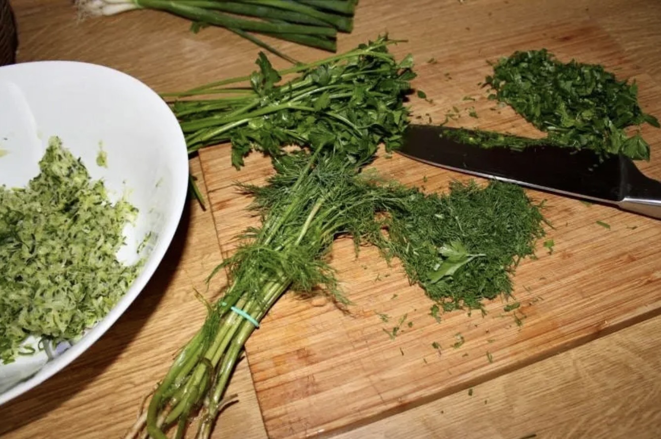 Zioła: duży pęczek koperku, duży pęczek natki pietruszki, nieco dymki