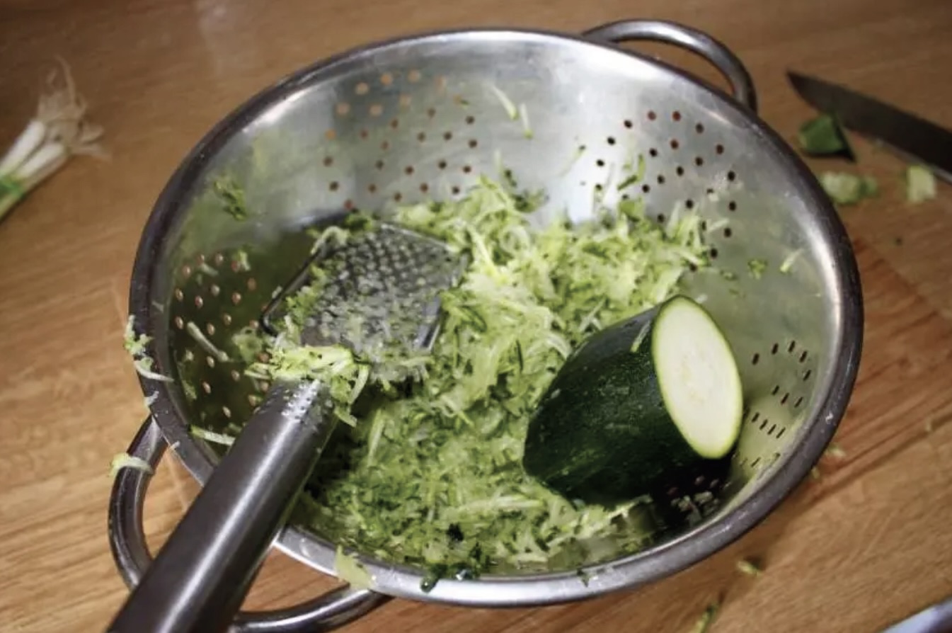 Przygotowanie cukinii: Cukinię zetrzyj na tarce o drobnych oczkach. Przełóż na durszlak, posól, dociśnij, a następnie odstaw na około 30 minut, aby puściła soki.