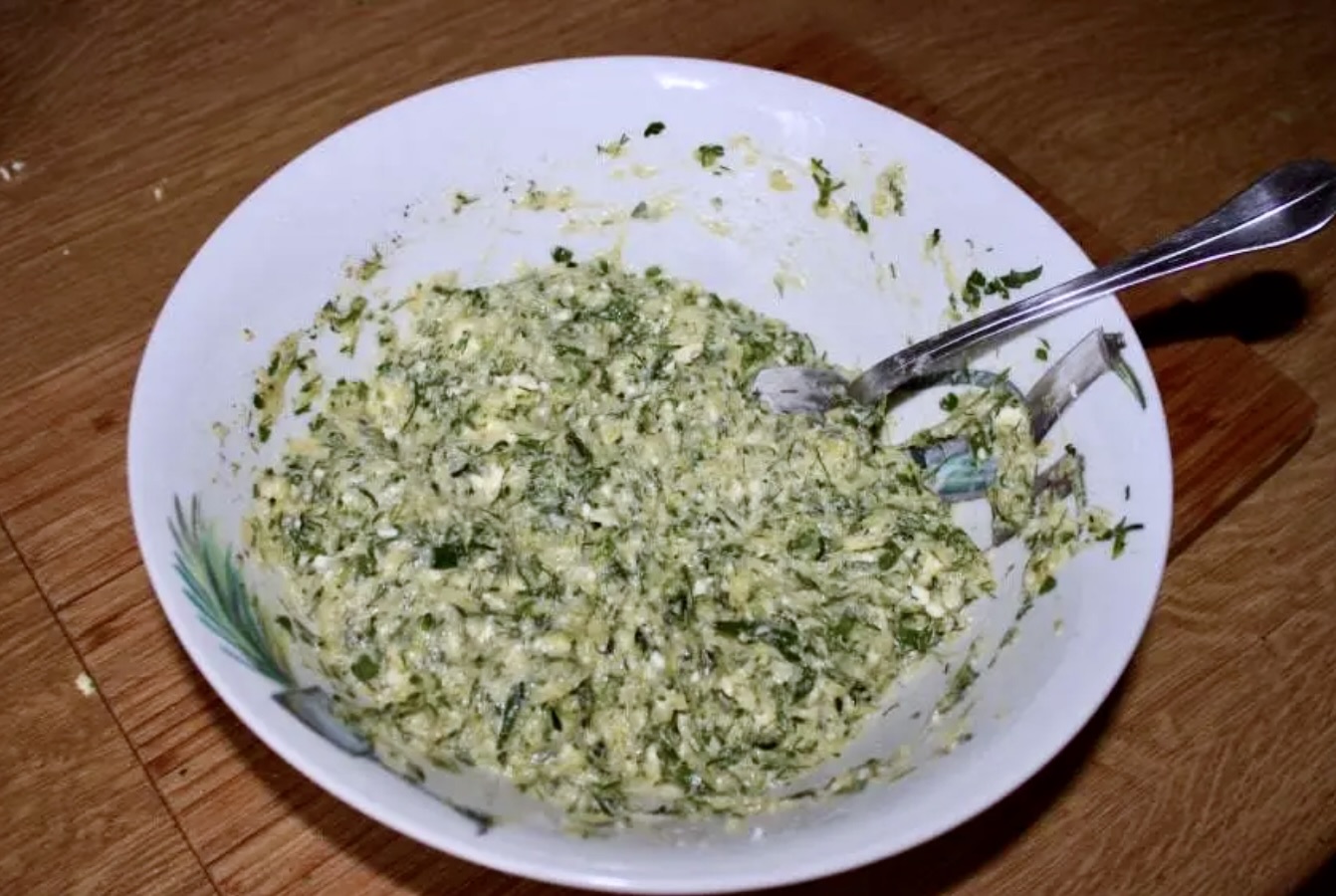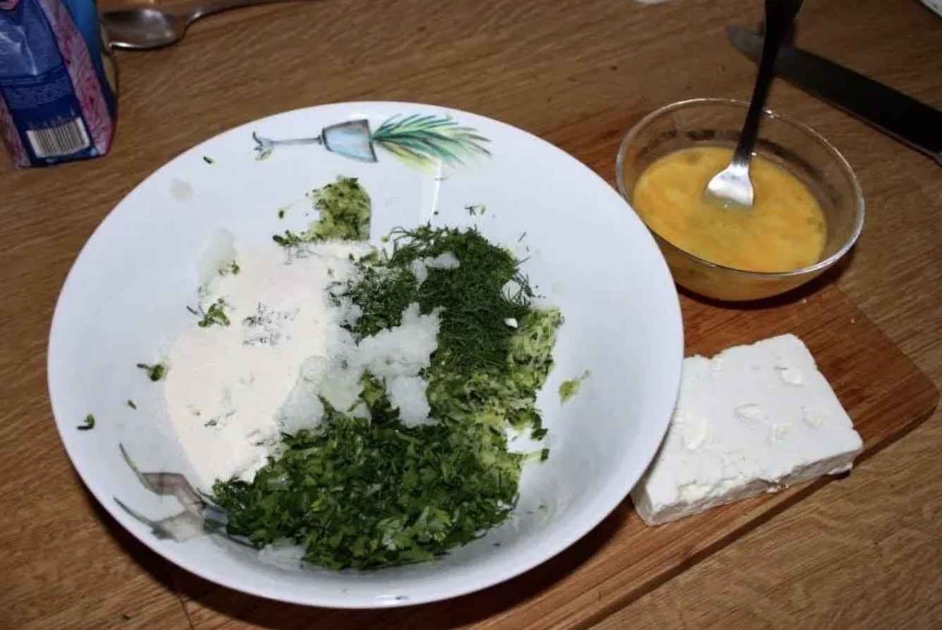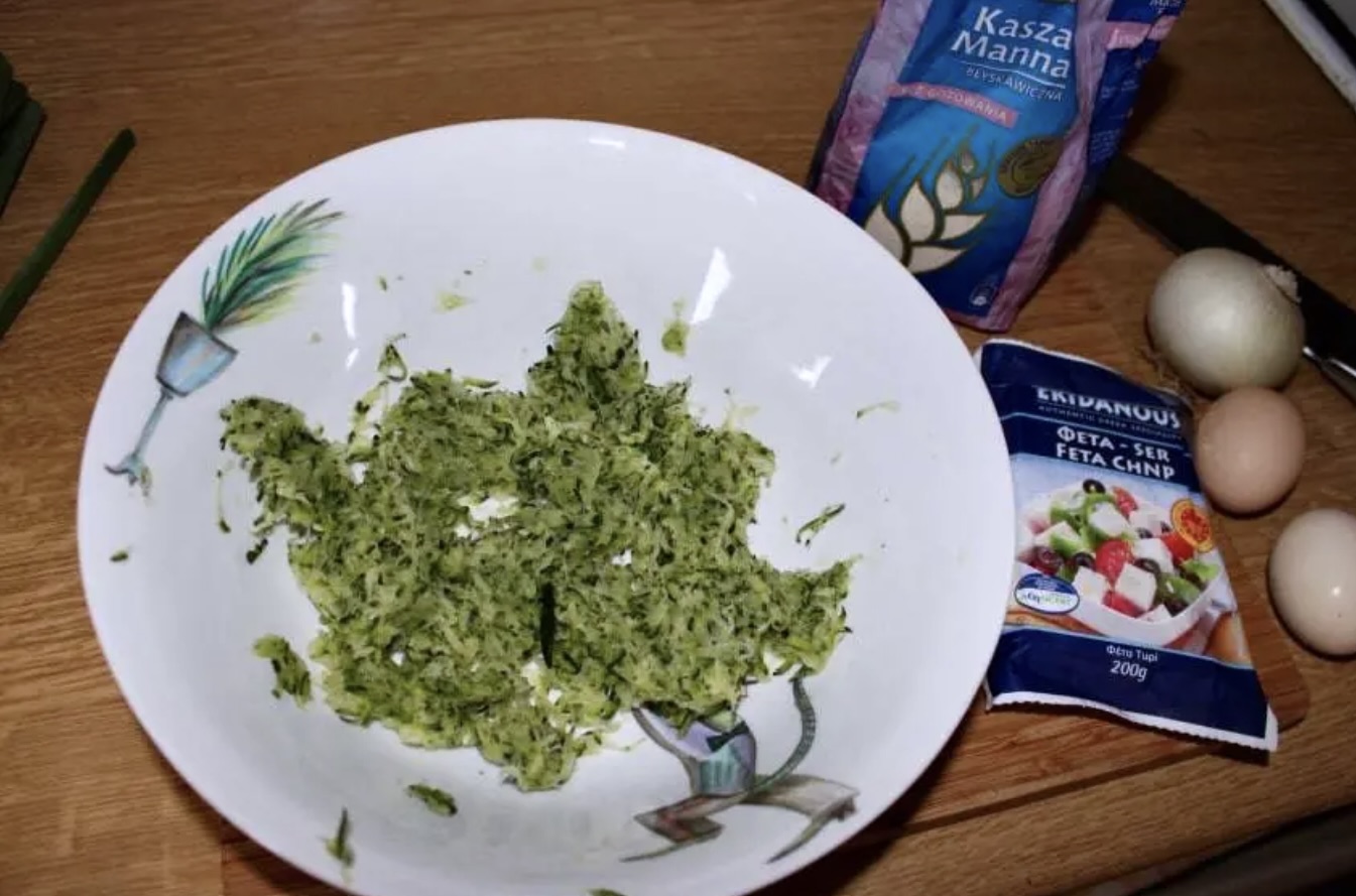 Łączenie składników: Do cukinii dodaj drobno posiekany koperek, natkę pietruszki i dymkę. Zetrzyj cebulę (jeśli nie została starta wcześniej z cukinią). Dodaj mąkę (lub grysik), pokruszony ser feta oraz roztrzepane jajka.