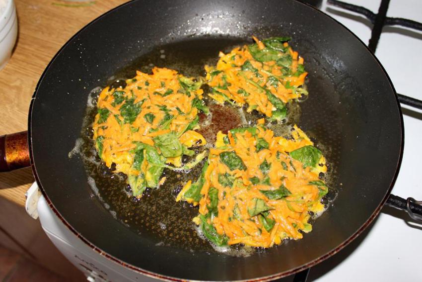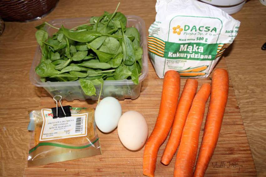 Warzywa: Marchewkę obierz (lub umyj) i zetrzyj na grubych oczkach tarki. Szpinak dokładnie umyj i osusz. Jeśli liście są duże, możesz je posiekać; małe listki pozostaw w całości.