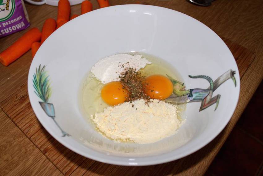 Przygotowanie ciasta: Wbij jajka do miski, dodaj mąkę oraz ulubioną przyprawę. Wymieszaj wszystko dokładnie, aż powstanie dość gęste ciasto (powinno być gęstsze niż naleśnikowe). Odstaw na chwilę.