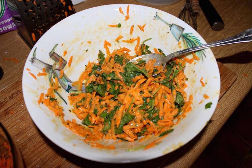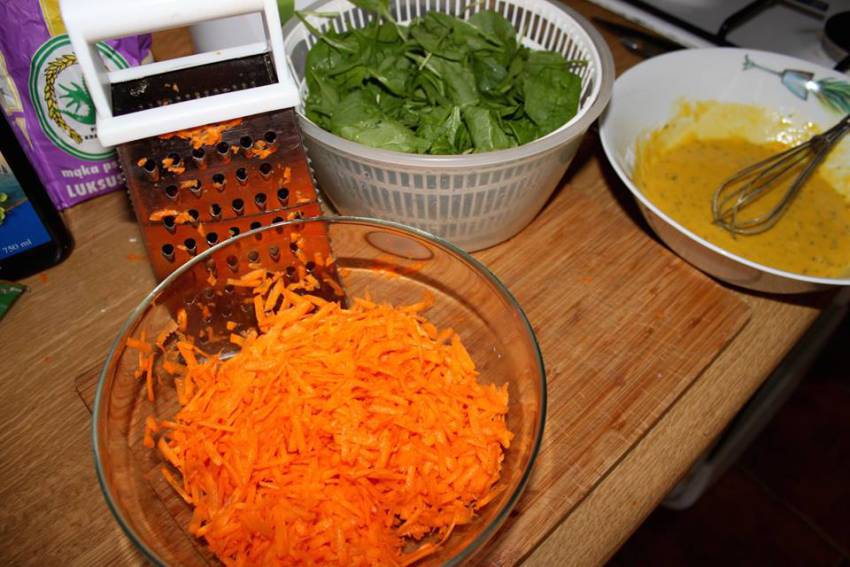 Łączenie składników: Do przygotowanego wcześniej ciasta dodaj tartą marchewkę i szpinak. Dopraw solą oraz pieprzem i dokładnie wymieszaj.