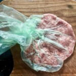 Formowanie kotletów: Podziel mięso na kawałki. Każdy kawałek spłaszcz (np. w woreczku lub ręcznie) na cienki placek o grubości około pół centymetra i średnicy 10–15 centymetrów.