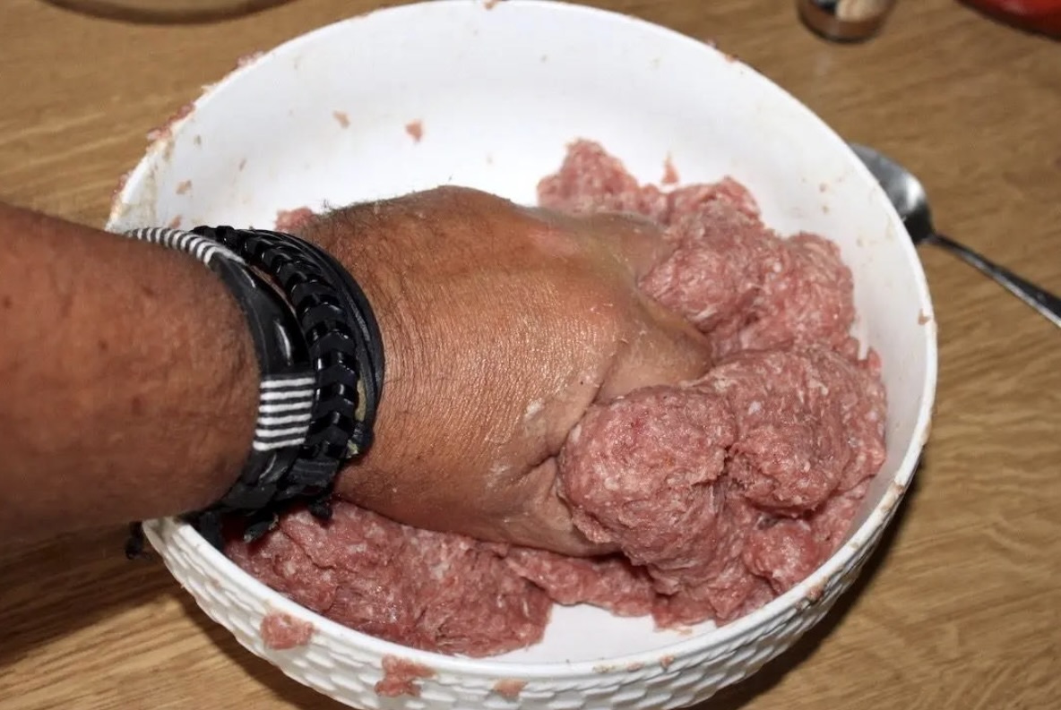 Wyrabianie: Wyrabiaj mięso (jak ciasto na pierogi) przez około 10 minut, aż stanie się klejące i aromatyczne.