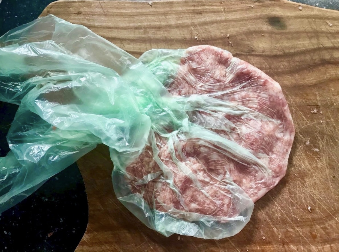 Formowanie kotletów: Podziel mięso na kawałki. Każdy kawałek spłaszcz (np. w woreczku lub ręcznie) na cienki placek o grubości około pół centymetra i średnicy 10–15 centymetrów.
