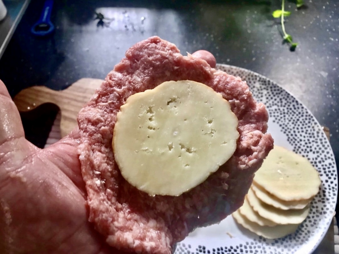 Nadziewanie: Na jeden placek mięsa połóż plaster sera, a następnie przykryj drugim plackiem. Uformuj kotleta tak, aby ser był całkowicie ukryty.