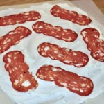 NUMER 1 Podpłomyk na ostro, creme fraiche (jak ją zrobić również znajdziesz na mojej stronie) wymieszana ze zmiażdżonymi dwoma ząbkami czosnku, a na to salami, ostre, bardzo ostre. Na wierzch nałóż starty ser edamski i pokrojone w drobną kosteczkę świeże papryki: żółta, czerwona i zielona. Kolorowo zawsze znaczy smaczniej. Teraz 5-6 minut w piekarniku w 250 stopniach i 1-2 minuty na górnej półce z grillem od góry. Tak aby „płomienie z pieca liznęły brzegi ciasta”. Chrupiąco i pysznie. Zobacz przepis na podpłomyk Diavolo, ostry jak brzytwa!