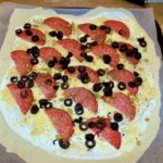NUMER 2 Podpłomyk, co chciałby być łagodny, ale jak zwykle i tak wyszedł na ostro. Czyli creme fraiche, starty ser edamski (dobrze rozpiekający się), łagodne salami, czarne oliwki, suszone oregano, no i drobniutko posiekana marynowana peperoncino. Do pieca tak, jak poprzednik, efekt boski.