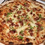 NUMER 4 Podpłomyk na mące razowej z creme fraiche, cebulą, kiełbasą wiejską i szczypiorkiem. Ciasto nie podrosło, jak na mące pszennej, ale to całkowicie normalne przy zastosowaniu mąki razowej.