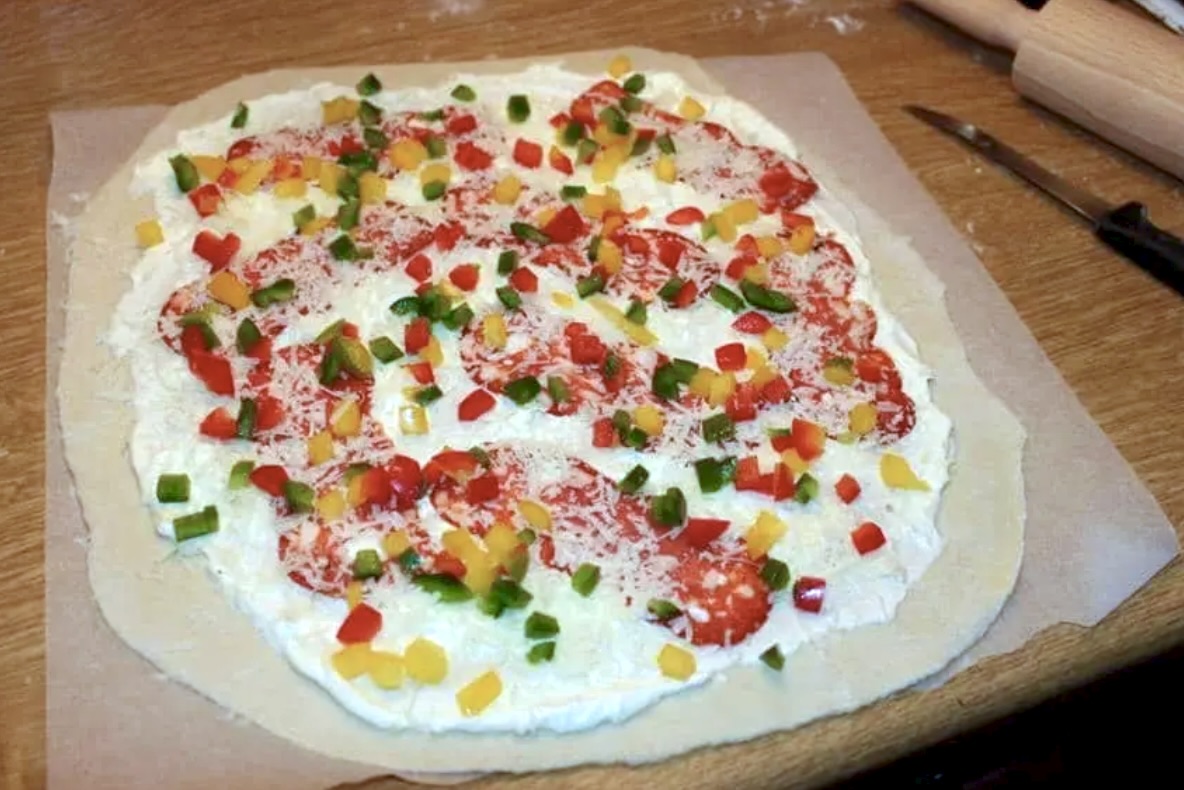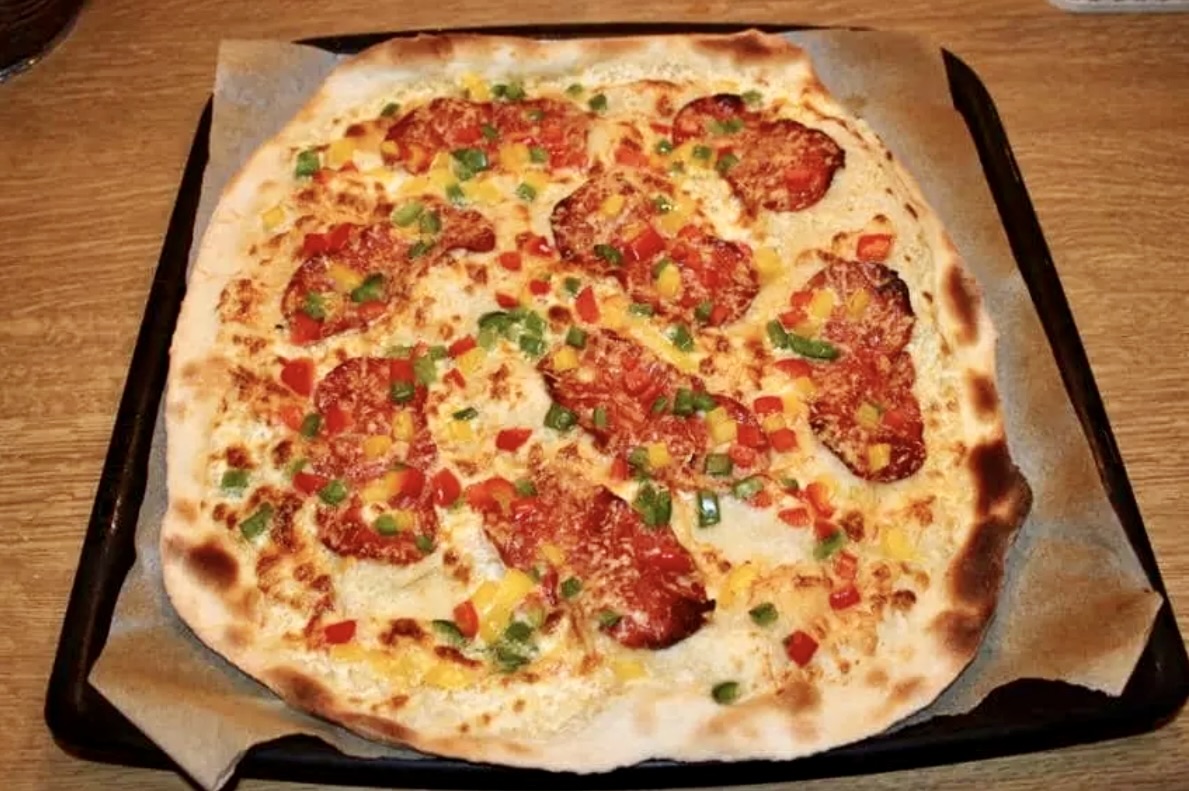 NUMER 1 Podpłomyk na ostro, creme fraiche (jak ją zrobić również znajdziesz na mojej stronie) wymieszana ze zmiażdżonymi dwoma ząbkami czosnku, a na to salami, ostre, bardzo ostre. Na wierzch nałóż starty ser edamski i pokrojone w drobną kosteczkę świeże papryki: żółta, czerwona i zielona. Kolorowo zawsze znaczy smaczniej. Teraz 5-6 minut w piekarniku w 250 stopniach i 1-2 minuty na górnej półce z grillem od góry. Tak aby „płomienie z pieca liznęły brzegi ciasta”. Chrupiąco i pysznie. Zobacz przepis na podpłomyk Diavolo, ostry jak brzytwa!