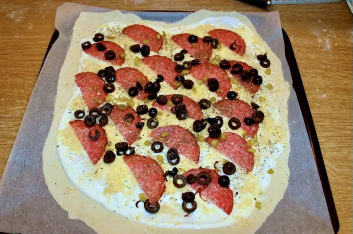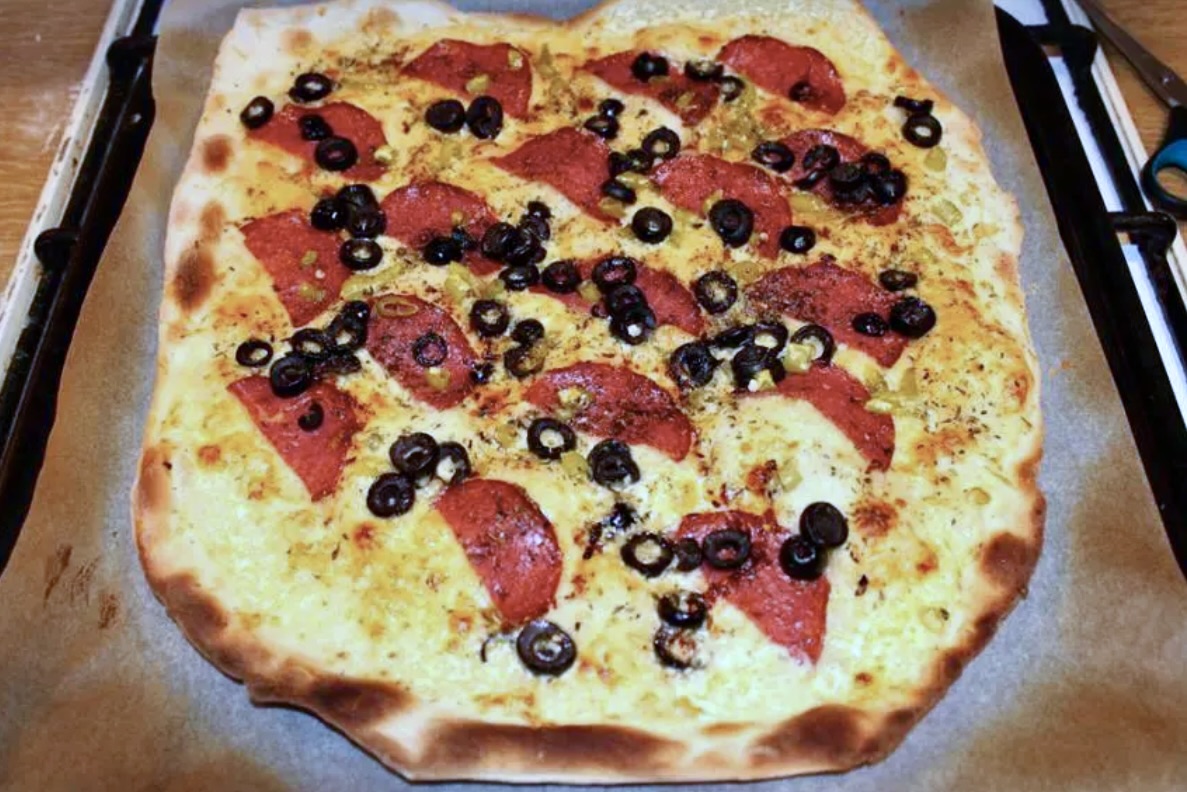 NUMER 2 Podpłomyk, co chciałby być łagodny, ale jak zwykle i tak wyszedł na ostro. Czyli creme fraiche, starty ser edamski (dobrze rozpiekający się), łagodne salami, czarne oliwki, suszone oregano, no i drobniutko posiekana marynowana peperoncino. Do pieca tak, jak poprzednik, efekt boski.
