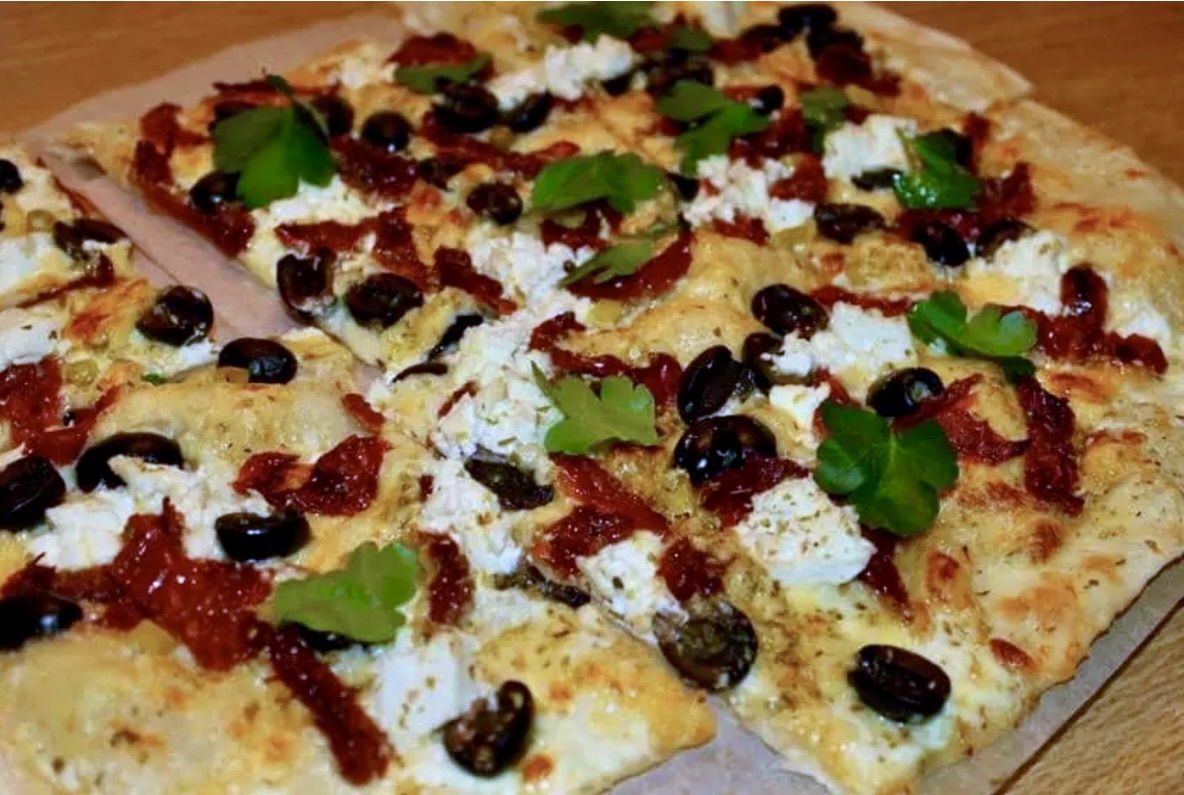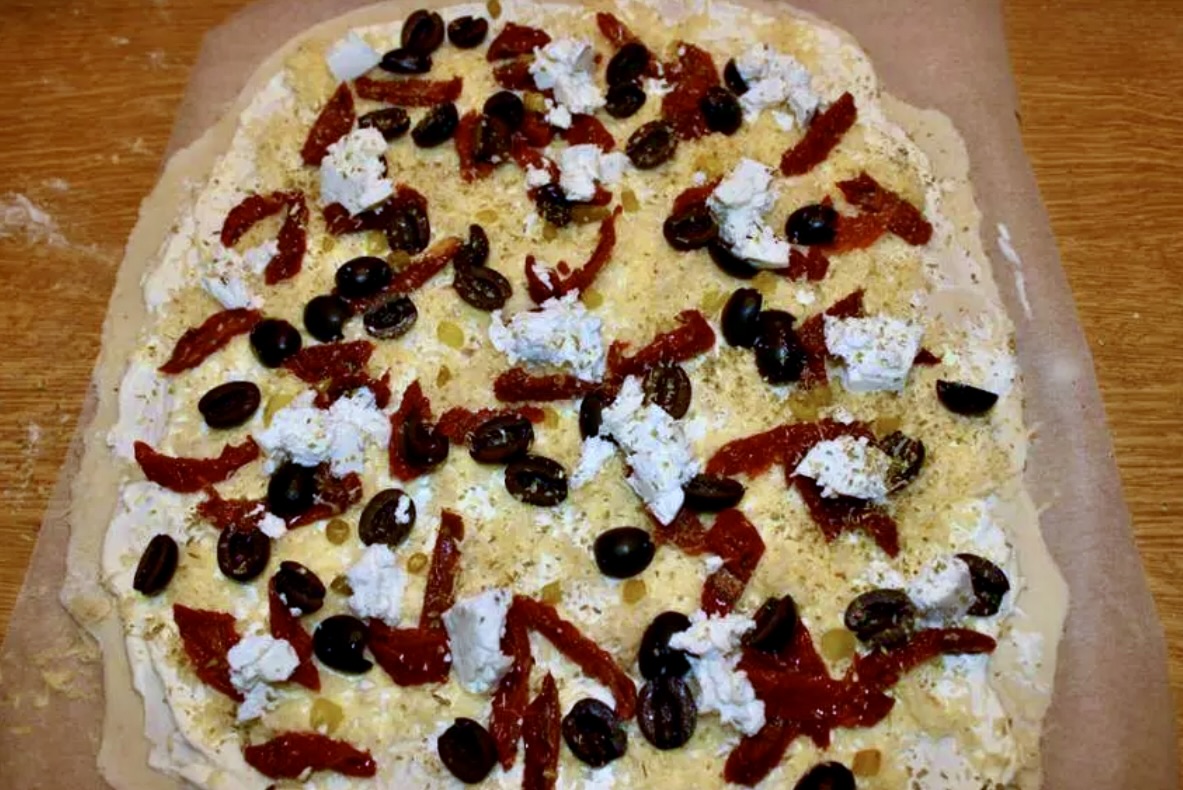 NUMER 3 Podpłomyk w stylu greckim, creme fraiche, starty ser edamski, suszone pomidory, czarne oliwki, feta, suszone oregano (marynowane peperoncino też w jakiś cudowny sposób się przedostało). Po upieczeniu koniecznie udekoruj natką pietruszki.