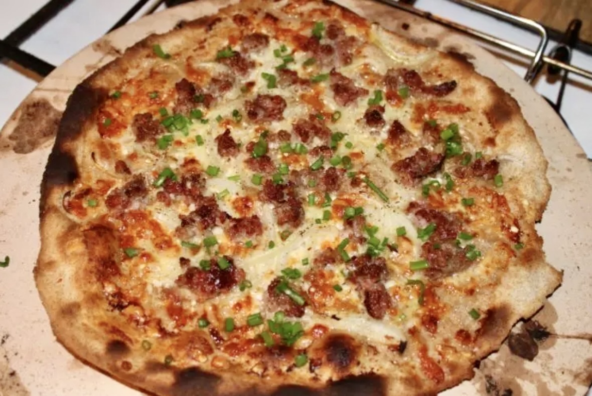 NUMER 4 Podpłomyk na mące razowej z creme fraiche, cebulą, kiełbasą wiejską i szczypiorkiem. Ciasto nie podrosło, jak na mące pszennej, ale to całkowicie normalne przy zastosowaniu mąki razowej.