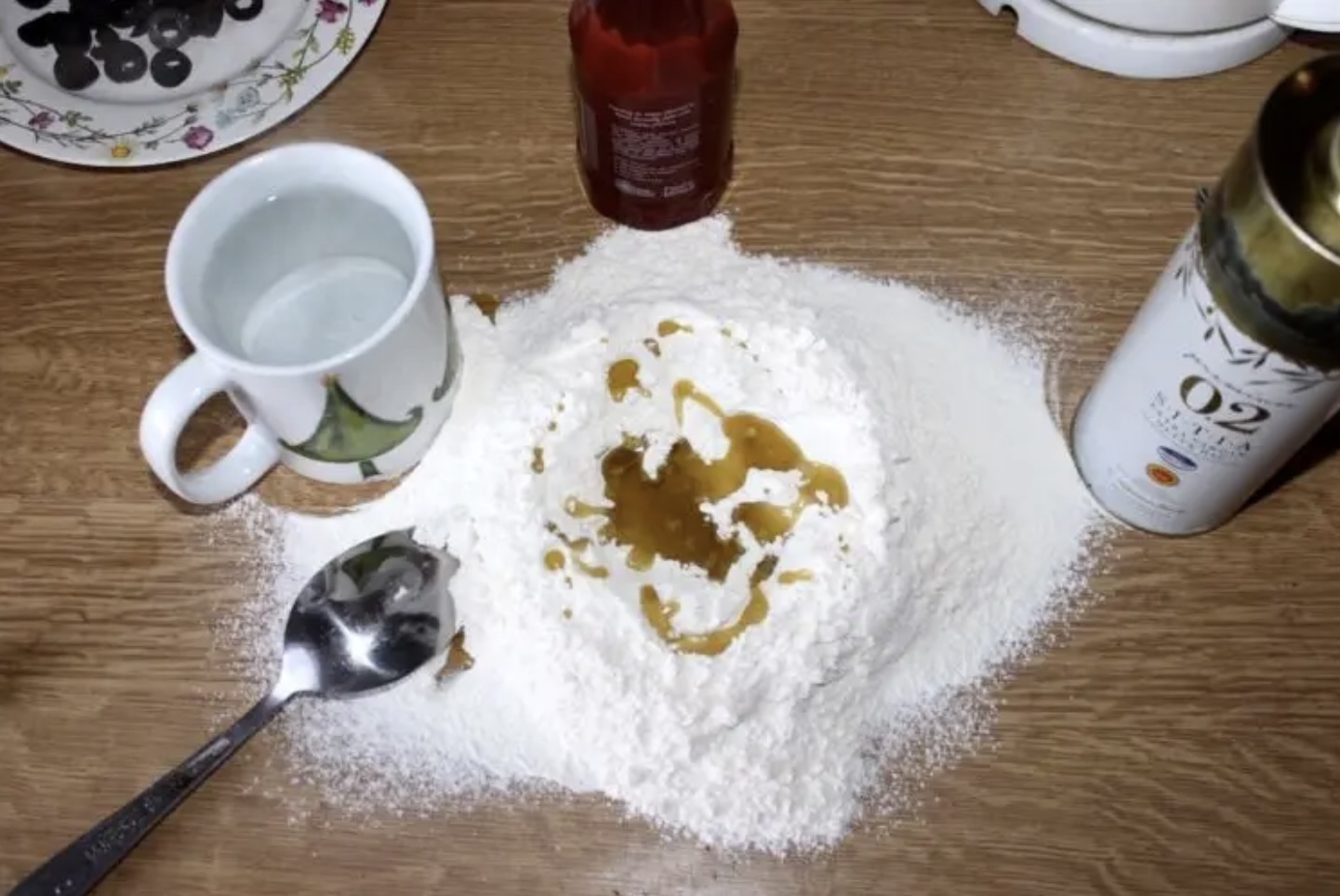 Na blat przesiej mąkę, dodaj szczyptę soli i oliwę. Przemieszaj i wsyp drożdże.