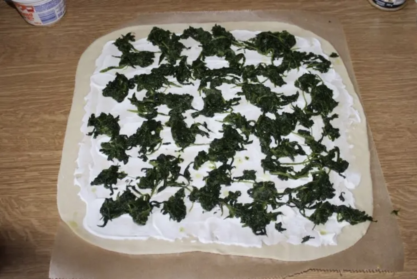 Odciskając liście szpinaku, rozłóż go na cieście.