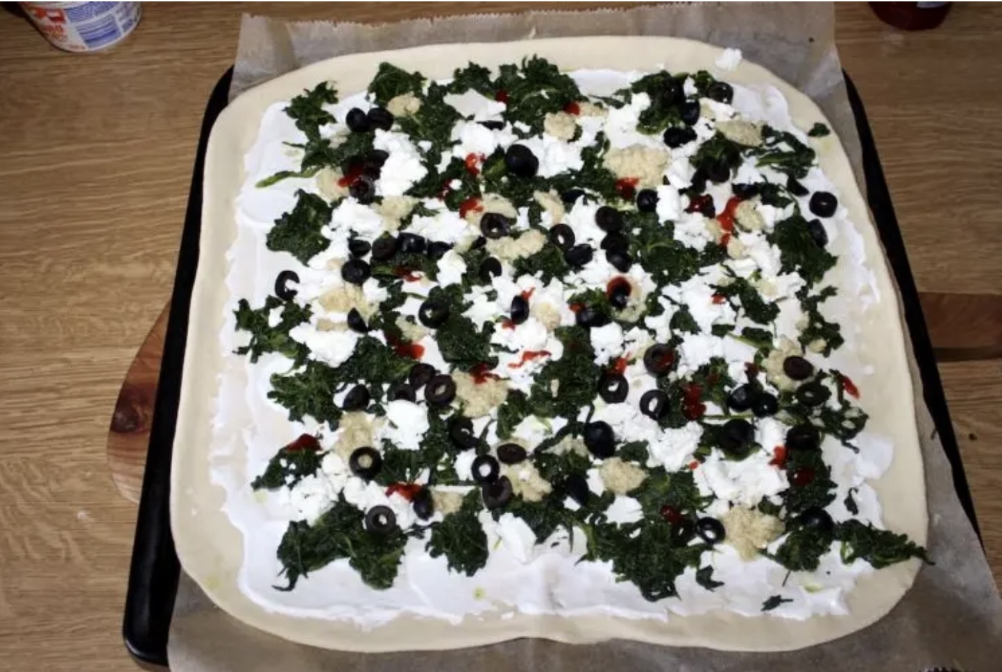 Pomiędzy szpinakiem rozłóż kawałki fety oraz pokrojone czarne oliwki (o których mowa w opisie, choć nie ma ich na liście składników). Jeśli masz, nałóż też nieco pasty z karczochów.
