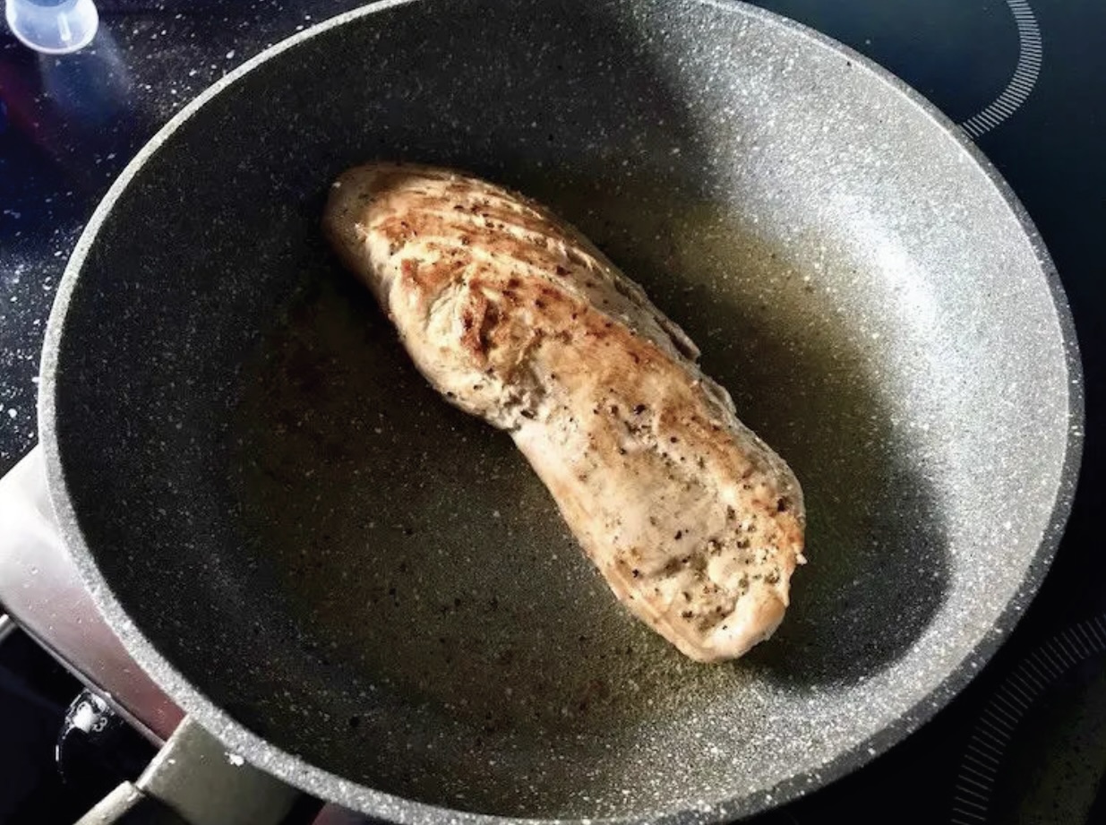 Na patelni rozgrzej oliwę z masłem, a następnie wrzuć przyprawioną polędwiczkę wieprzową.