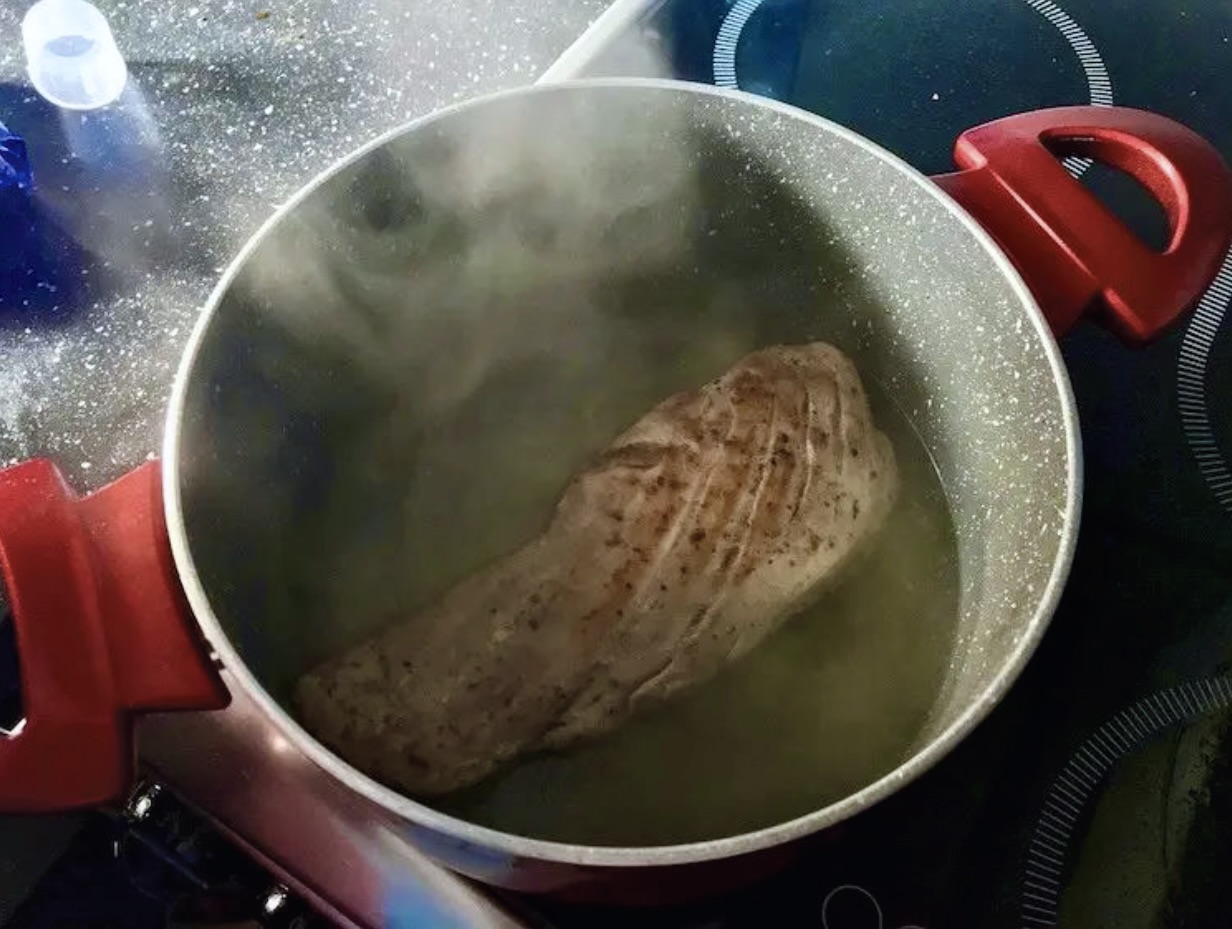 Przesmażoną polędwiczkę przełóż do garnka i podlej gorącą wodą.