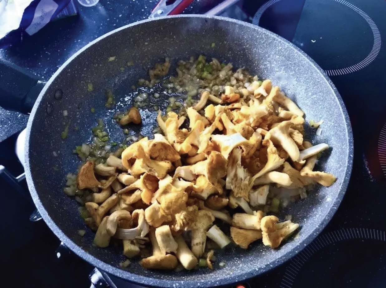 Na przesmażoną cebulę wrzuć wcześniej przygotowane kurki.
