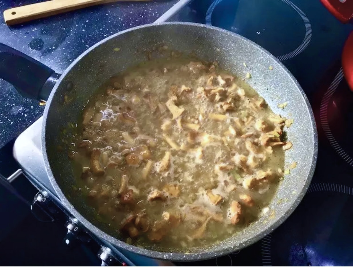 Wlej na patelnię do grzybów pół szklanki gorącej wody i duś grzyby 10 minut na wolnym ogniu.