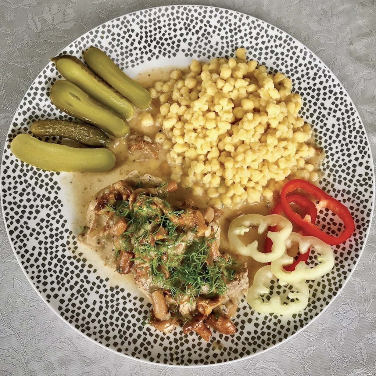 Podawaj np. z makaronem (np. zacierką – wcześniej przesmażoną i następnie ugotowaną) oraz ogórkami konserwowymi lub kiszonymi.