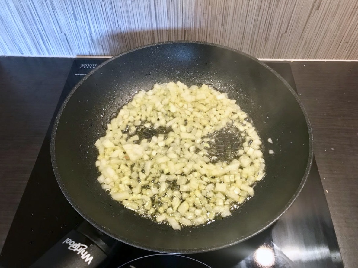 Na patelni rozgrzej oliwę i nieco masła, a następnie wrzuć cebulę. Smaż krótko, aby się zeszkliła.