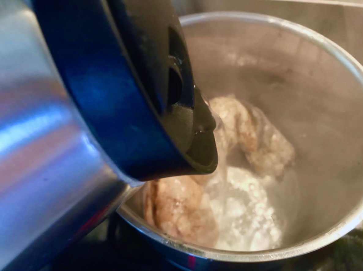 Dolej szklankę gorącej wody, przykryj garnek pokrywką i duś mięso na wolnym ogniu 15 do 20 minut (w zależności od wielkości polędwiczki).