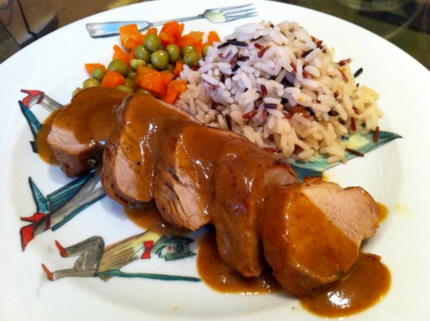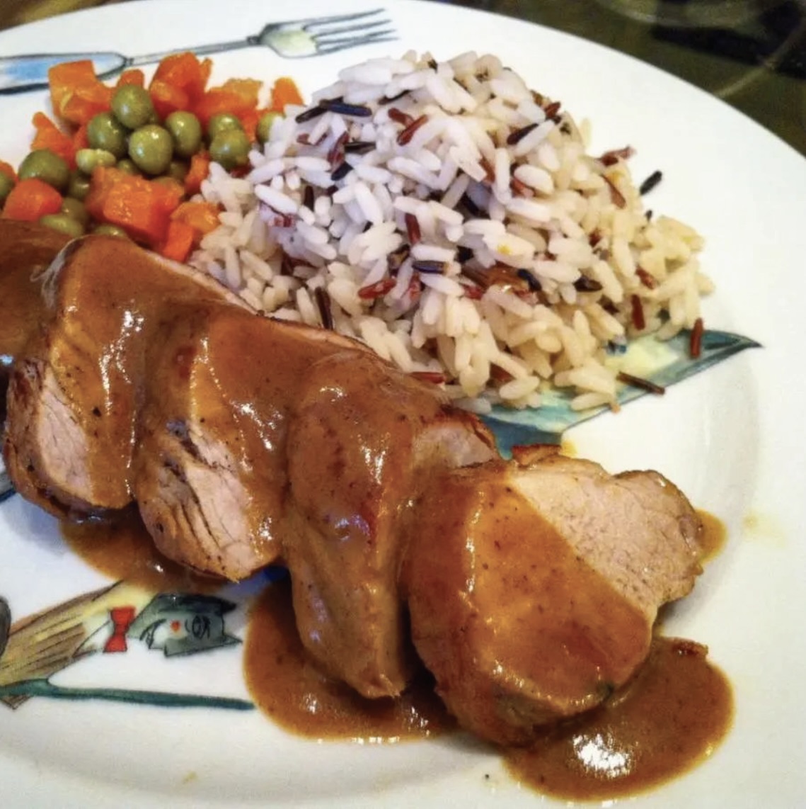 Polędwiczki w miodzie podawaj na przykład z kolorowym ryżem i groszkiem z marchewką.