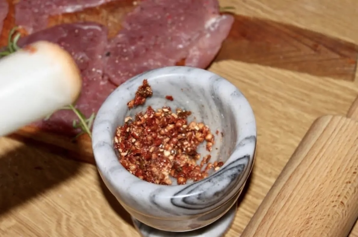 Do moździerza wrzuć połowę odsączonego czerwonego pieprzu i utrzyj „na grubo”, aby wydobyć aromat.