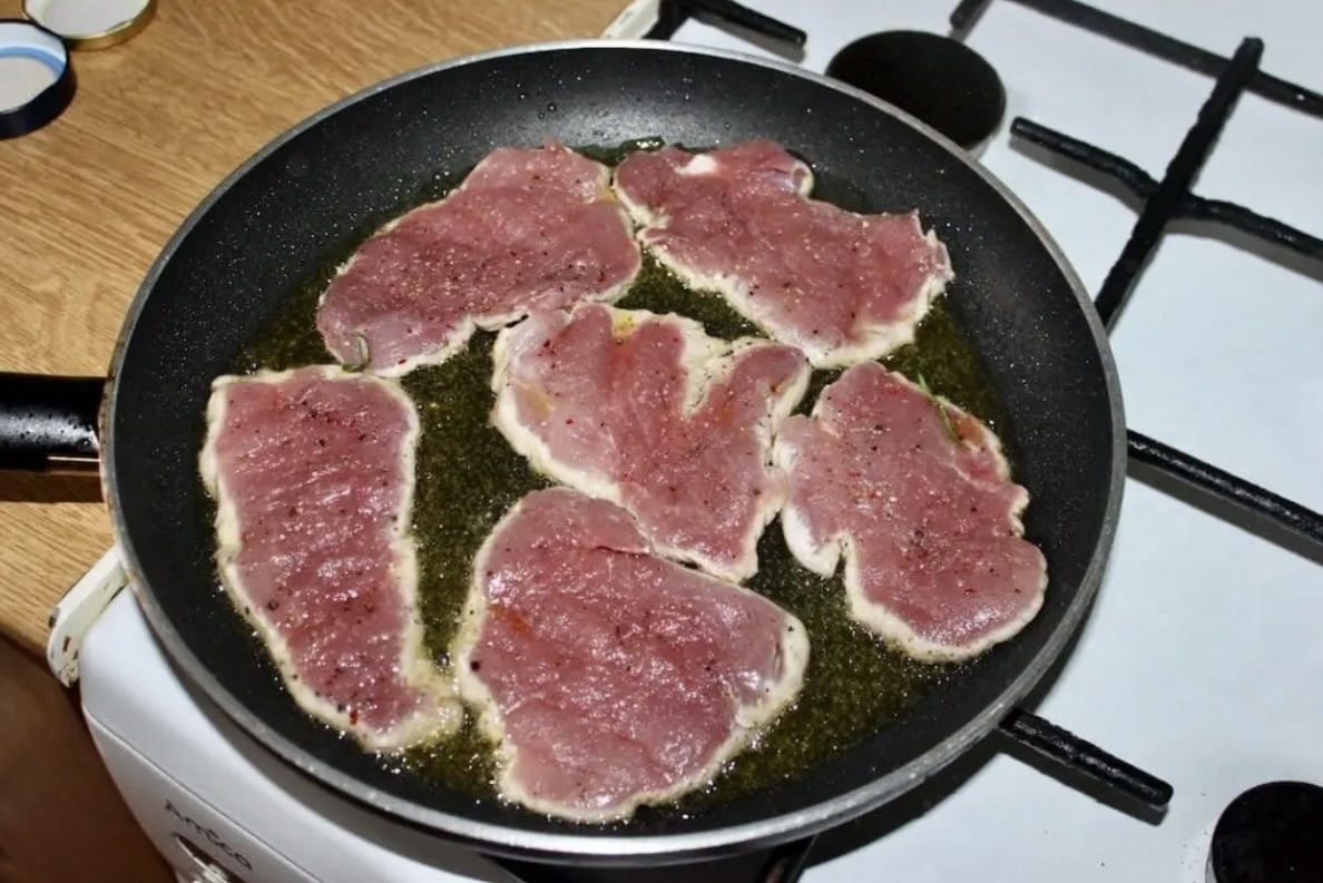 Smażenie mięsa: Na patelni rozgrzej oliwę i smaż kotleciki na mocnym ogniu. Polędwiczka wieprzowa powinna być smażona na mocnym ogniu z obu stron nie dłużej, niż 2-3 minuty łącznie, aby „zamknąć” mięso i by pozostało soczyste w środku.