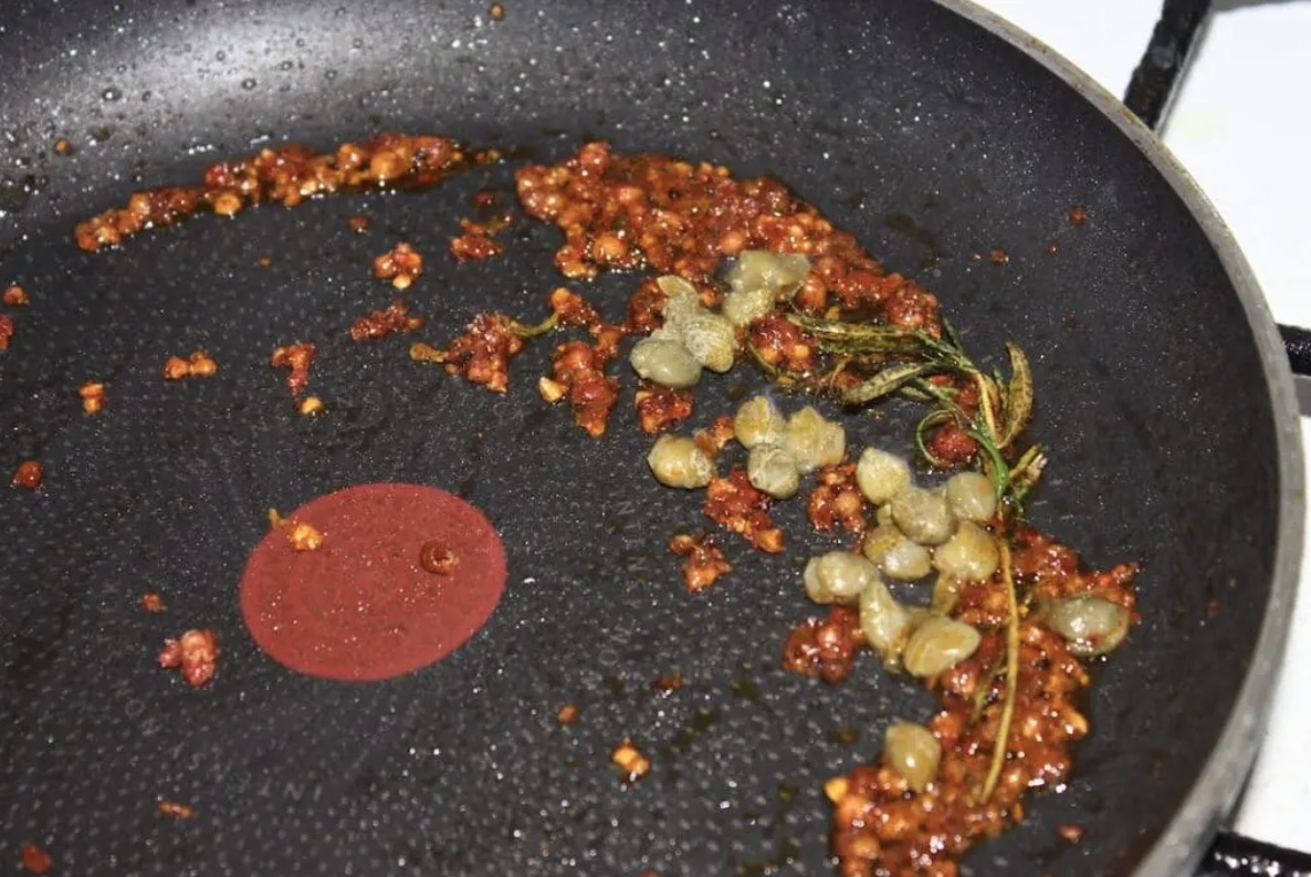 Przygotowanie sosu: Odlej nadmiar tłuszczu ze smażenia polędwiczki i wrzuć na patelnię zmiażdżony czerwony pieprz oraz gałązki rozmarynu. Dorzuć również kapary.