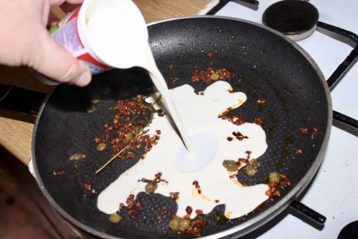 Gdy przyprawy się podsmażą i uwolnią aromaty, wlej na patelnię śmietanę.