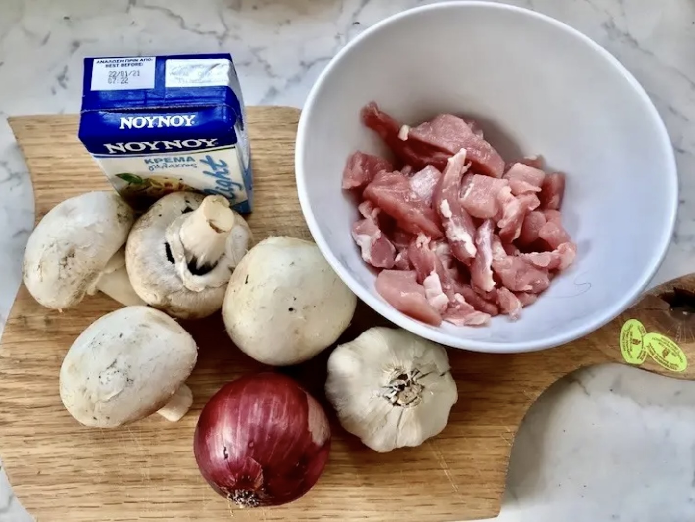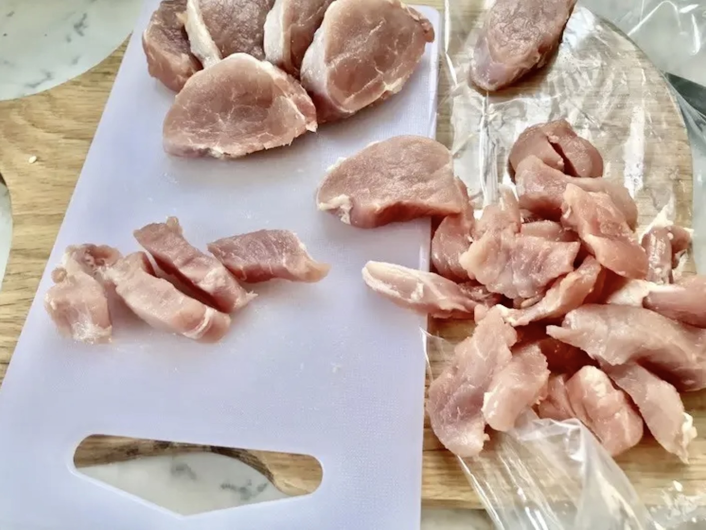 Mięso: Polędwiczkę wieprzową pokrój w plastry, a następnie w paski.