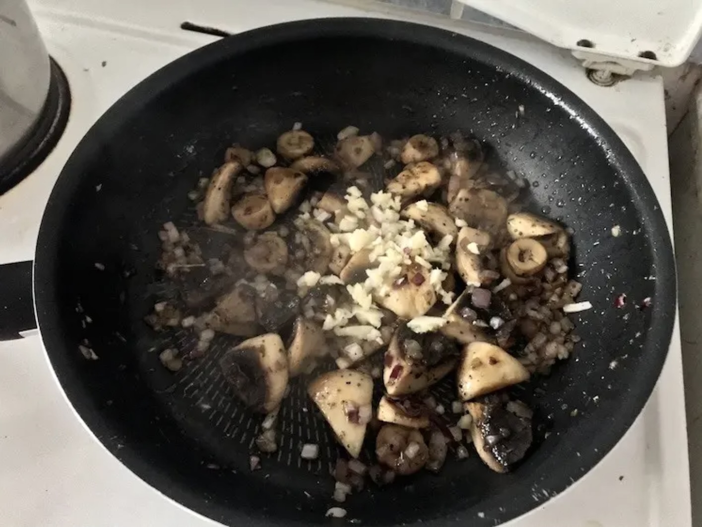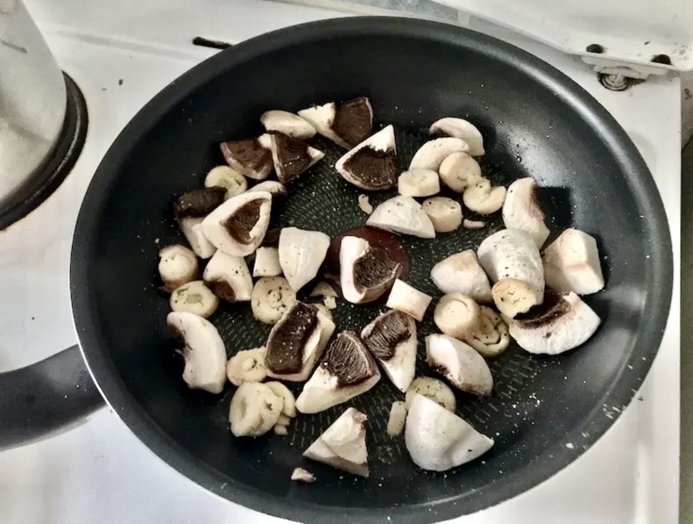 Na patelnię wlej oliwę i wrzuć pieczarki. Następnie posól i popieprz (ostrożnie, ponieważ bulion też jest słony).