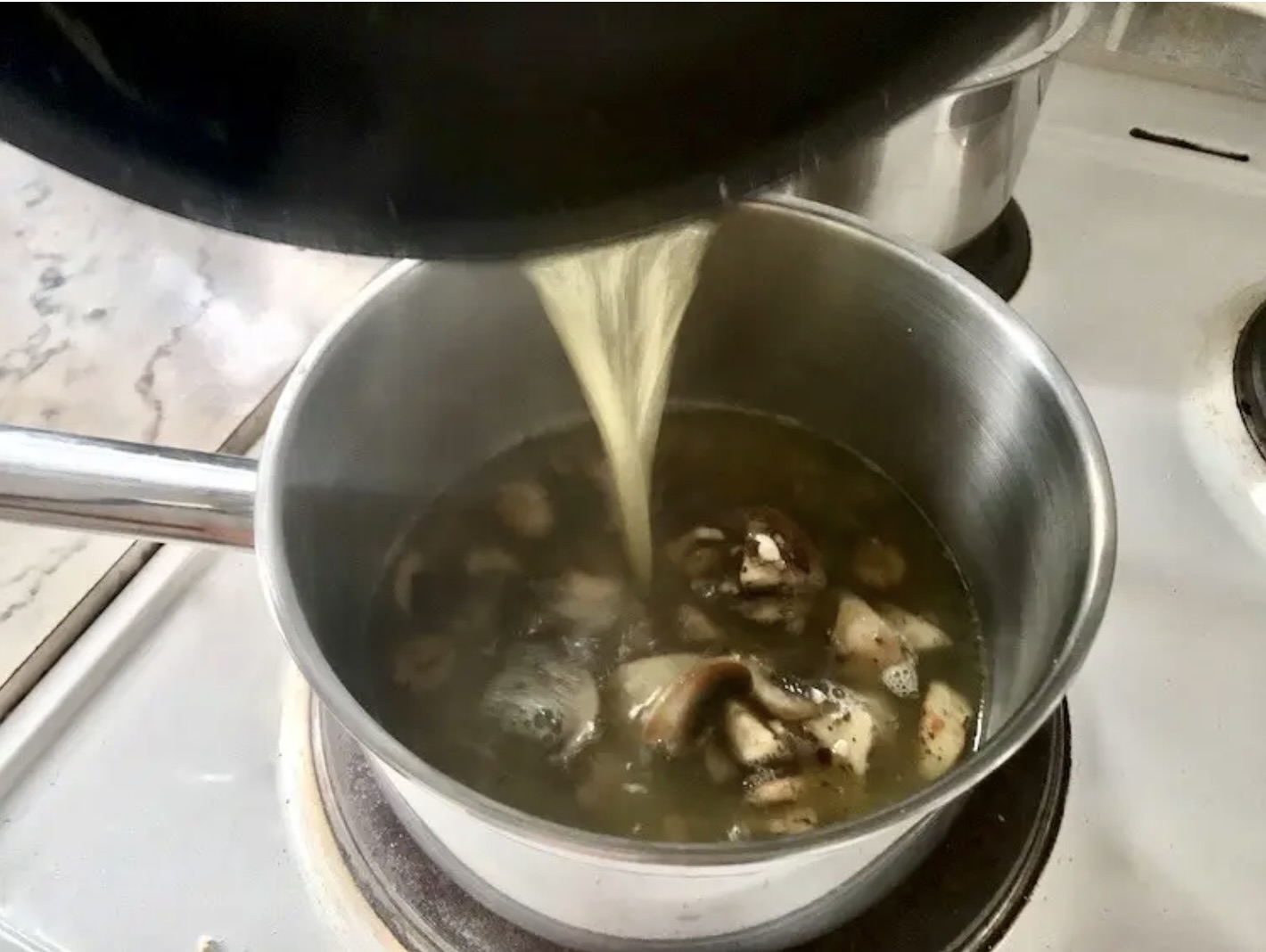 Przełóż przesmażone pieczarki do rondelka, wlej gorący bulion, przykryj i gotuj przez 15 minut.