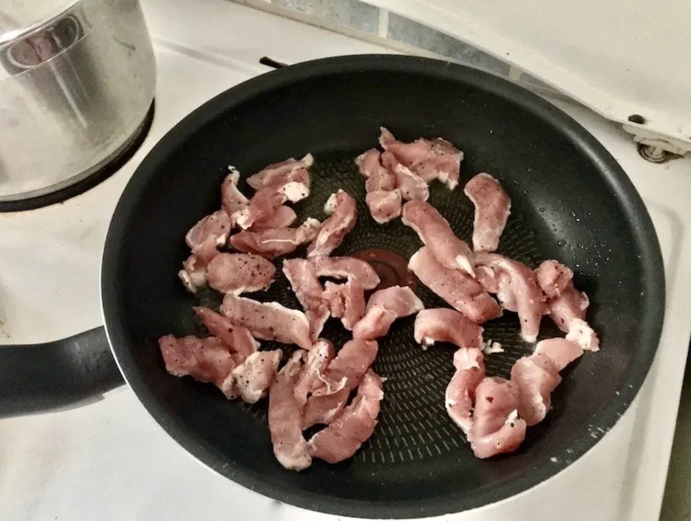 W czasie gotowania pieczarek, na tej samej patelni usmaż paski mięsa. Następnie dopraw je solą i świeżo zmielonym pieprzem.
