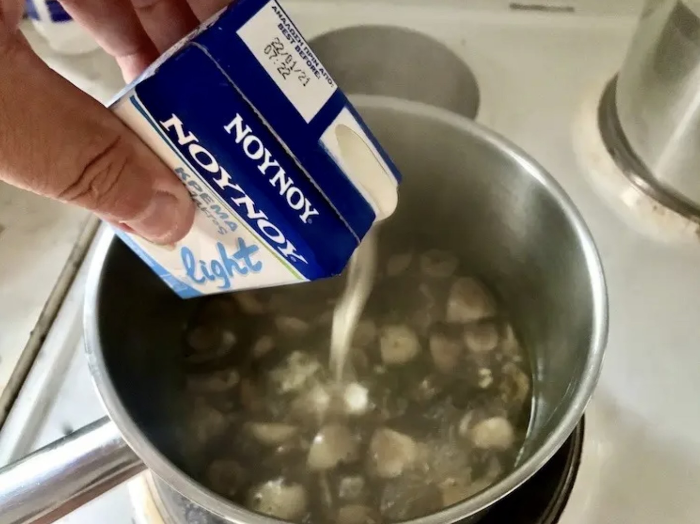Do gotujących się pieczarek w rondelku wlej słodką śmietankę (około 50 ml lub do uzyskania pożądanej konsystencji).