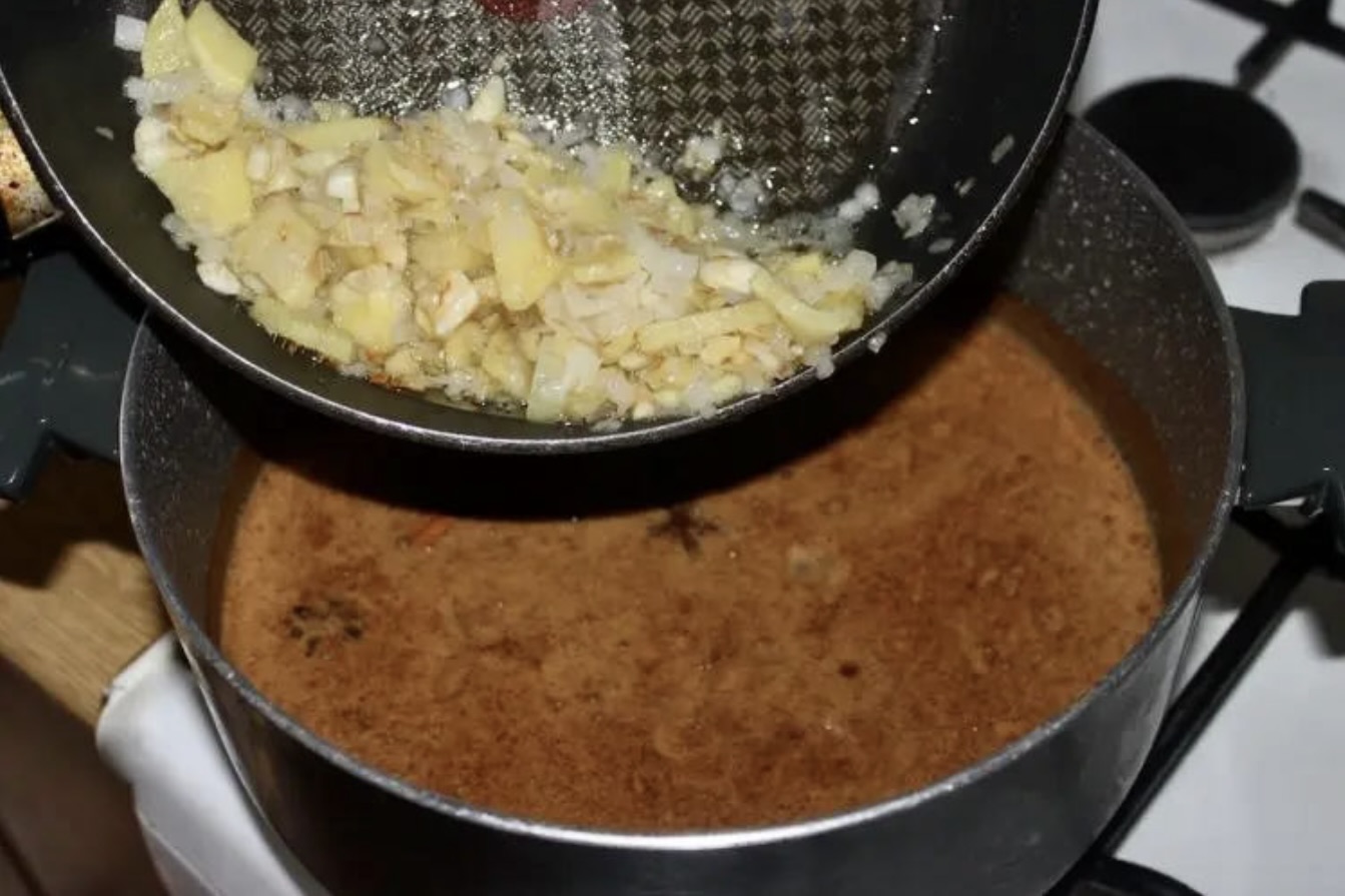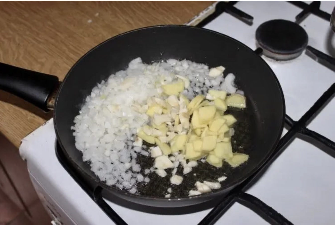 Smaż cebulę, imbir i czosnek na oleju arachidowym na średnim ogniu, aż cebula się zeszkli (nie przypalaj).