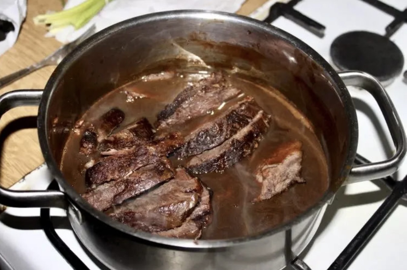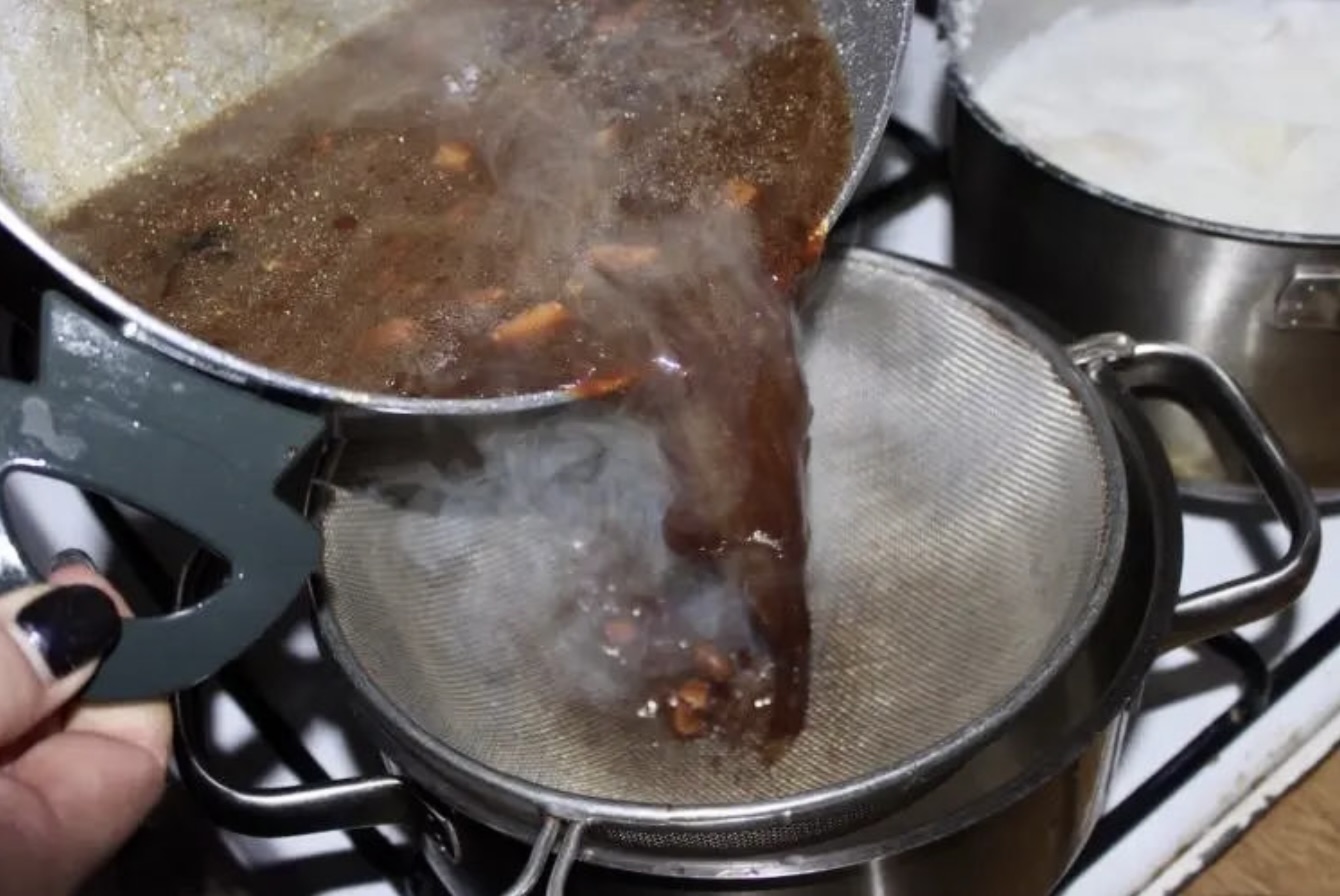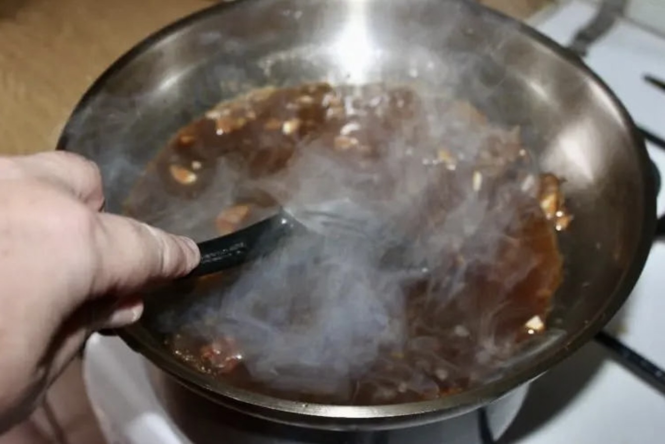 Na patelnię po smażeniu wlej chochlę wywaru, zeskrob pozostałości, a następnie przelej płyn do garnka (deglasowanie).